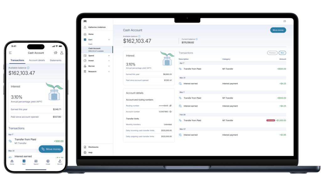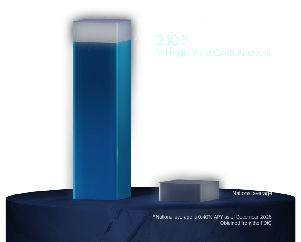 ¹ Stated APY (annual percentage yield) with the M1 High-Yield Cash Account is accrued on account balance. Obtaining stated APY requires a minimum initial deposit of $100. APY is solely determined by M1 Finance LLC and its partner banks, and will include administrative and account fees that may reduce earnings. Rates are subject to change without notice. M1 High-Yield Cash Account is a separate offering from, and not linked to, the M1 High Yield Savings Accounts offered by M1 Spend LLC’s banking partner. M1 is not a bank.