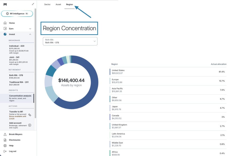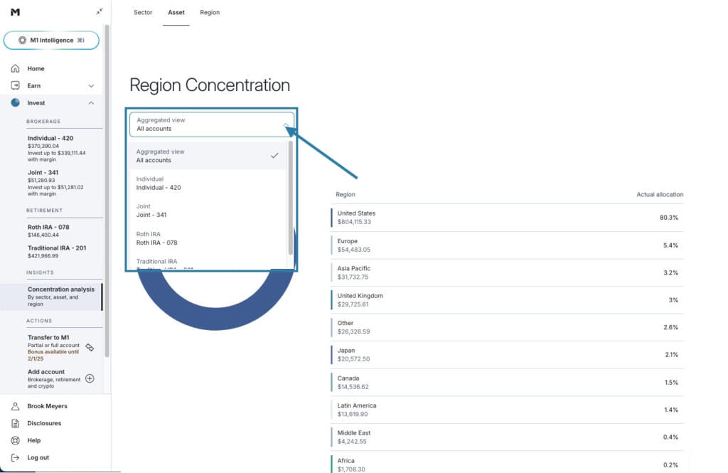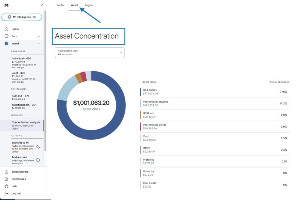 Other investors may have a more specific vision for their investment strategy: say, 70% equities and 30% bond exposure. With Concentration Analysis on M1, you can drill down even deeper and see how specifically that’s broken up.