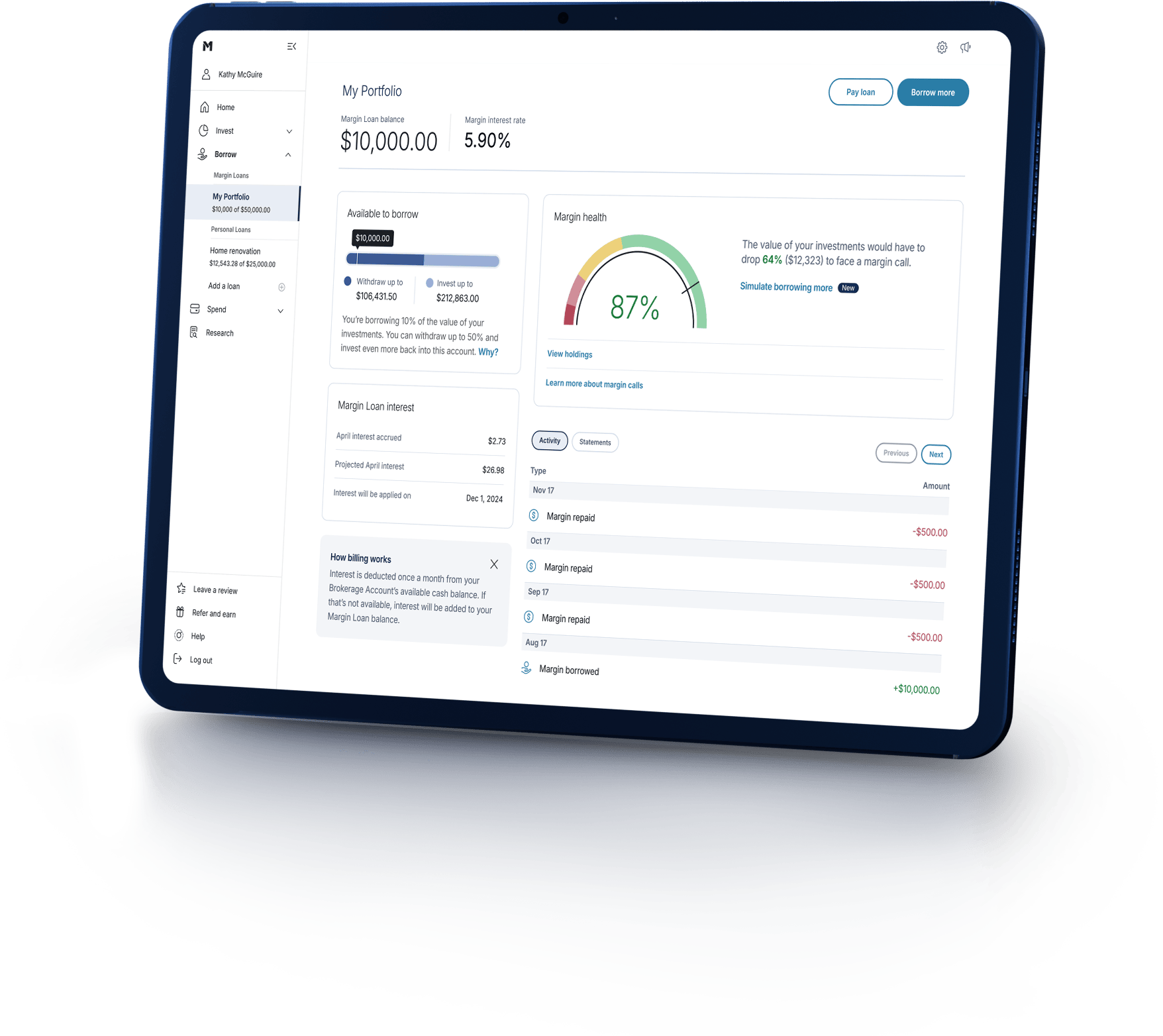 A Margin Loan is a type of secured loan that allows you to borrow against the value of the securities you already own in your M1 Individual Brokerage Account, Joint Brokerage Account, and/or Trust Account. It is an interest-bearing loan that uses your underlying securities (eg. stocks, ETFs) as collateral to act as a flexible line of credit when you need it.