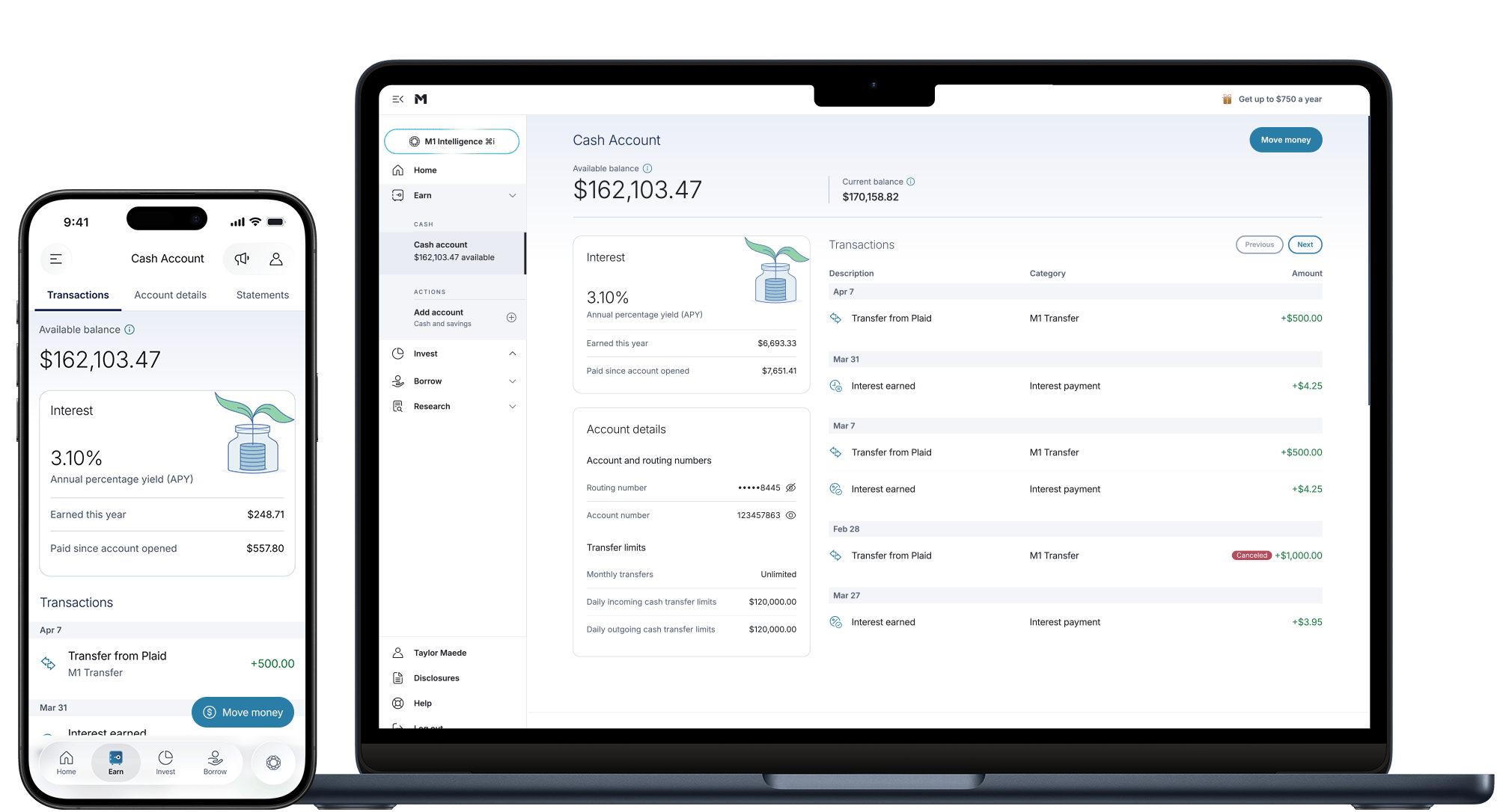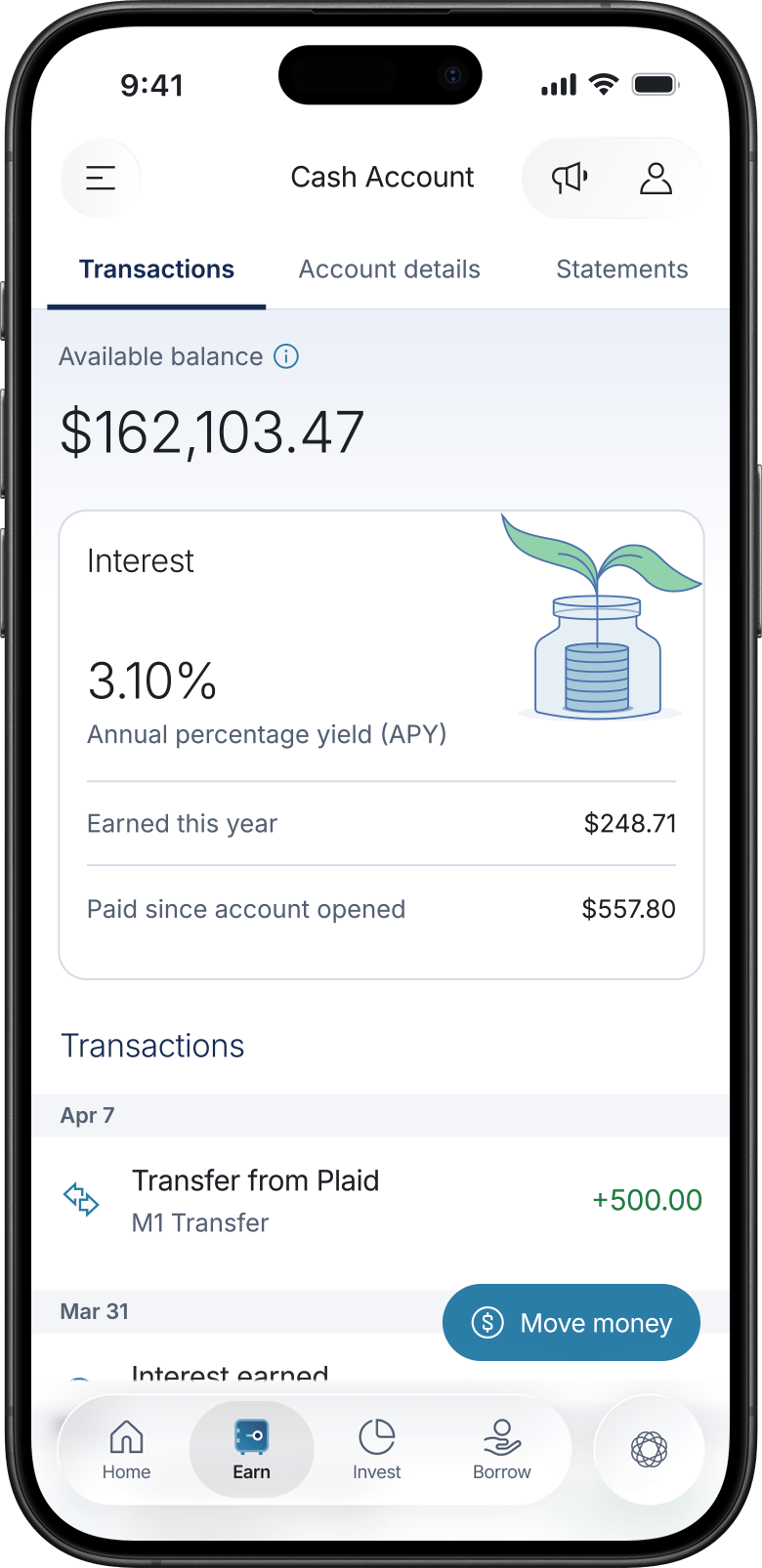 ¹ Stated APY (annual percentage yield) with the M1 High-Yield Cash Account is accrued on account balance. Obtaining stated APY requires a minimum initial deposit of $100. APY is solely determined by M1 Finance LLC and its partner banks, and will include administrative and account fees that may reduce earnings. Rates are subject to change without notice. M1 High-Yield Cash Account is a separate offering from, and not linked to, the M1 High Yield Savings Accounts offered by M1 Spend LLC’s banking partner. M1 is not a bank.