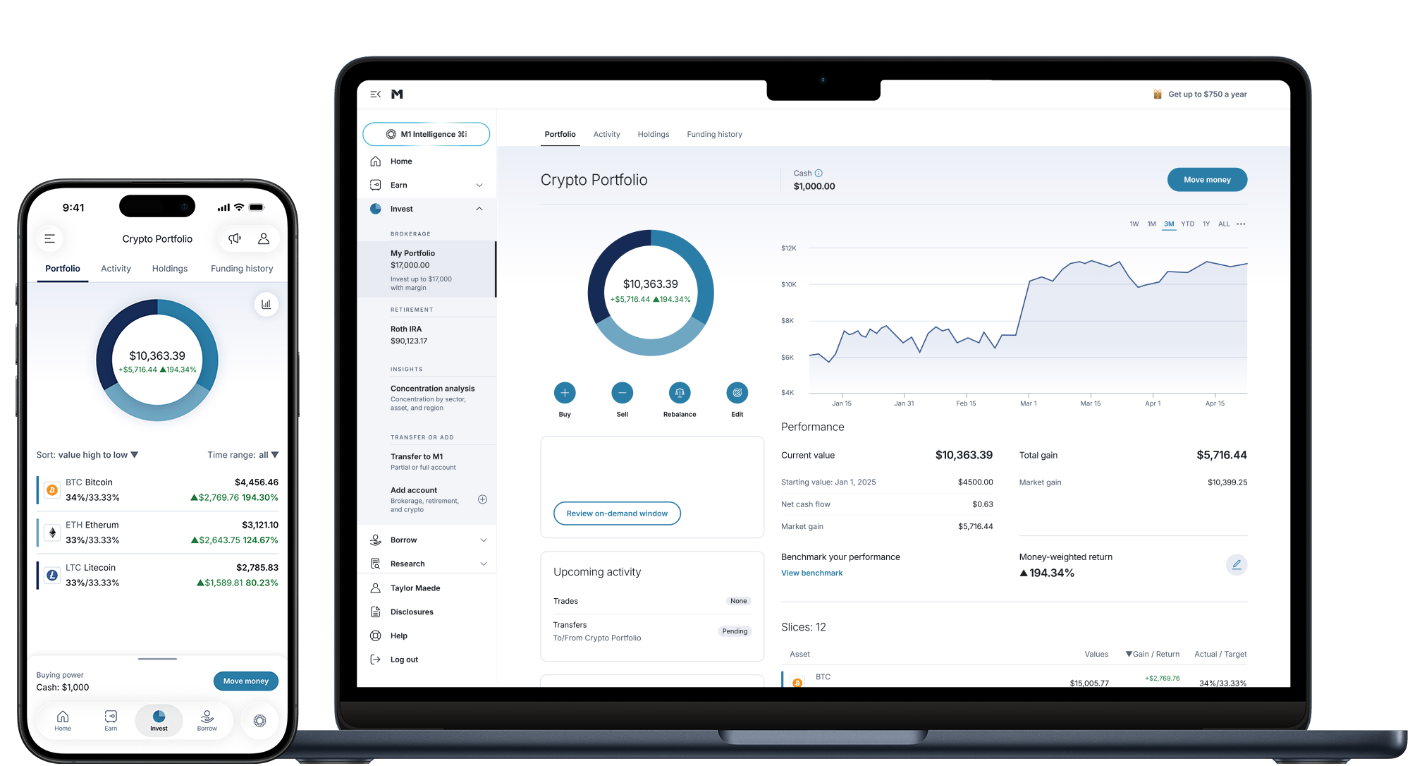 Crypto services, execution, and custody are provided by Bakkt Crypto Solutions LLC (NMLS ID 1828849) through a software licensing agreement with M1 Digital LLC. Bakkt Crypto Solutions LLC and M1 Digital LLC are not registered broker-dealers or FINRA members and your crypto holdings are not securities and are not FDIC or SIPC insured.